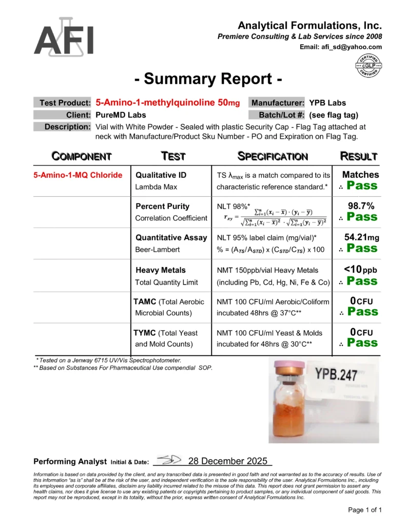 A single-component research material supplied for controlled research environments. 5-amino-1MQ (5 mg) is a small-molecule compound studied for its role as a selective NNMT (nicotinamide N-methyltransferase) inhibitor in metabolic and cellular energy research.