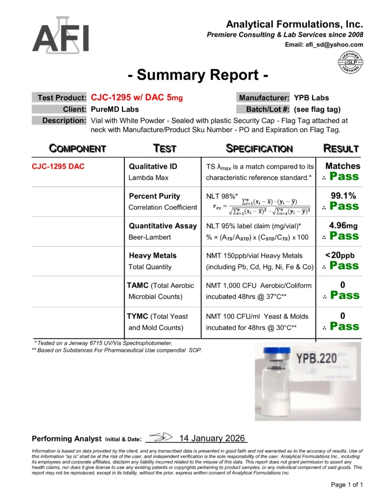 Each lot is sourced through our verified global supply chain with emphasis on traceability and quality control. We work diligently to obtain and maintain third-party analytical reports (HPLC/LC-MS) and Certificates of Analysis for each batch, as part of our ongoing quality process. These documents are reviewed internally and displayed as they become available. Independent third-party testing is also performed on select lots to confirm identity, purity, and alignment with our internal specifications.