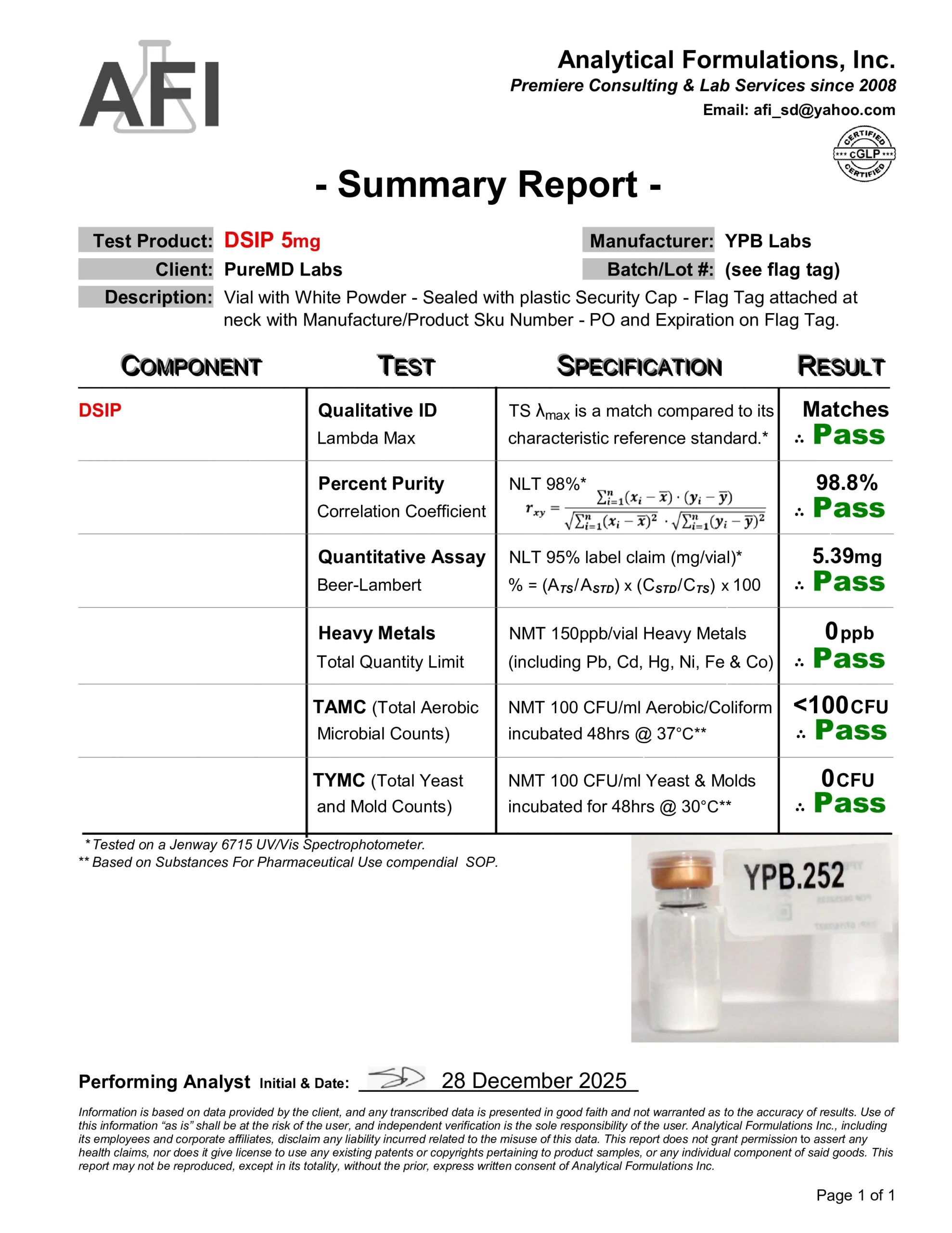 Each lot is sourced through our verified global supply chain with emphasis on traceability and quality control. We work diligently to obtain and maintain third-party analytical reports (HPLC/LC-MS) and Certificates of Analysis for each batch, as part of our ongoing quality process. These documents are reviewed internally and displayed as they become available. Independent third-party testing is also performed on select lots to confirm identity, purity, and alignment with our internal specifications.