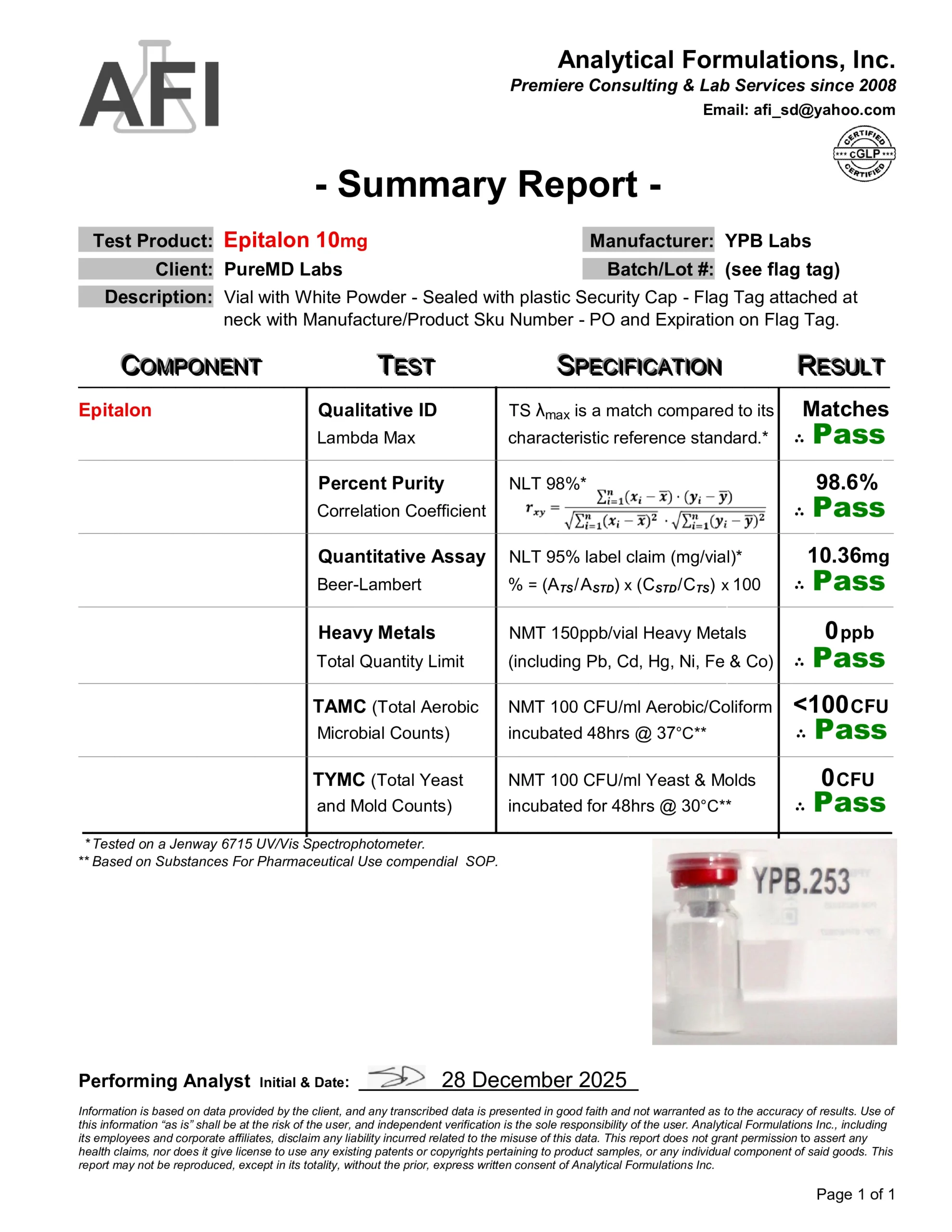 Each lot is sourced through our verified global supply chain with emphasis on traceability and quality control. We work diligently to obtain and maintain third-party analytical reports (HPLC/LC-MS) and Certificates of Analysis for each batch, as part of our ongoing quality process. These documents are reviewed internally and displayed as they become available. Independent third-party testing is also performed on select lots to confirm identity, purity, and alignment with our internal specifications.