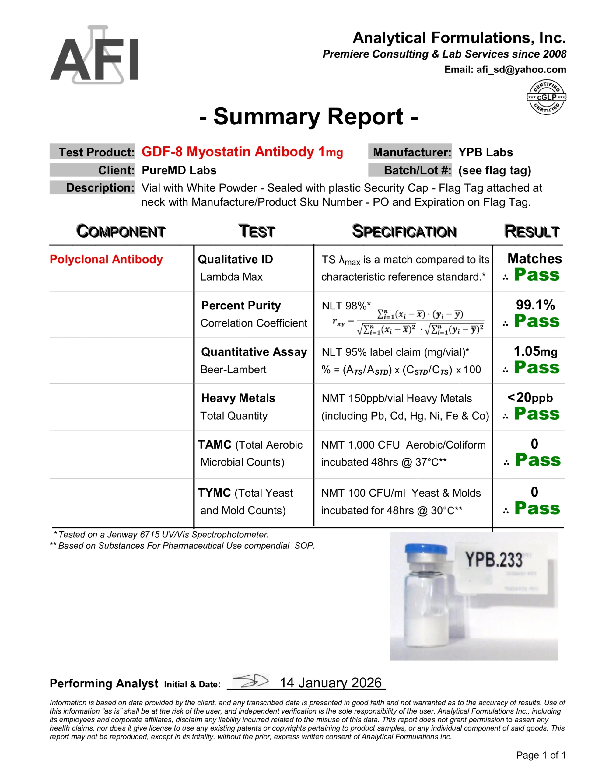 We require a verified purity of 99% or higher and perform independent third-party spot testing to confirm that select lots meet our internal standards for identity, purity, and composition. Where available, endotoxin testing results are included on Certificates of Analysis to verify laboratory purity; their inclusion is for research quality assessment only and does not imply suitability for human or veterinary use.