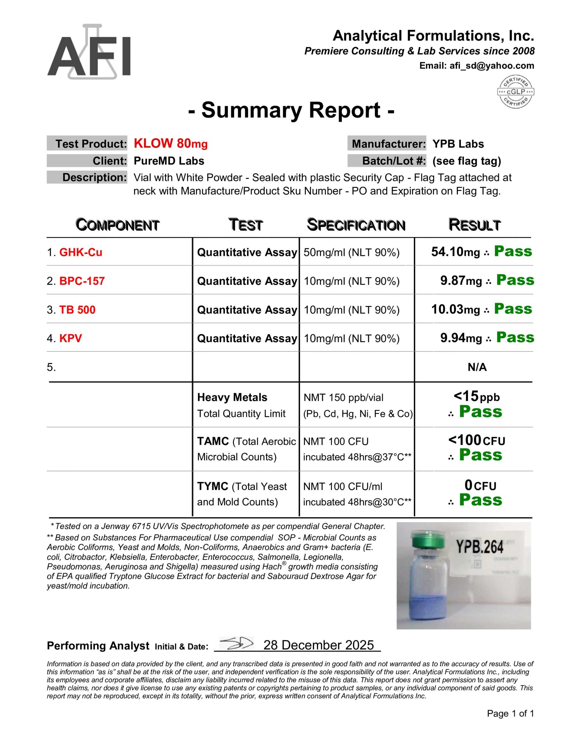 We require a verified purity of 99% or higher and perform independent third-party spot testing to confirm that select lots meet our internal standards for identity, purity, and composition. Where available, endotoxin testing results are included on Certificates of Analysis to verify laboratory purity; their inclusion is for research quality assessment only and does not imply suitability for human or veterinary use.