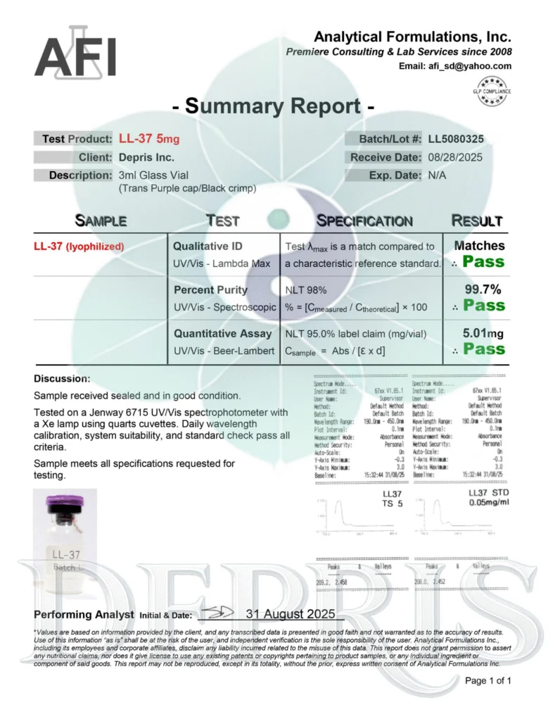 A single-component research material supplied for controlled research environments. LL-37 is a synthetic cathelicidin-derived peptide used in research exploring innate immunity, antimicrobial pathways, and wound-healing models in controlled systems.