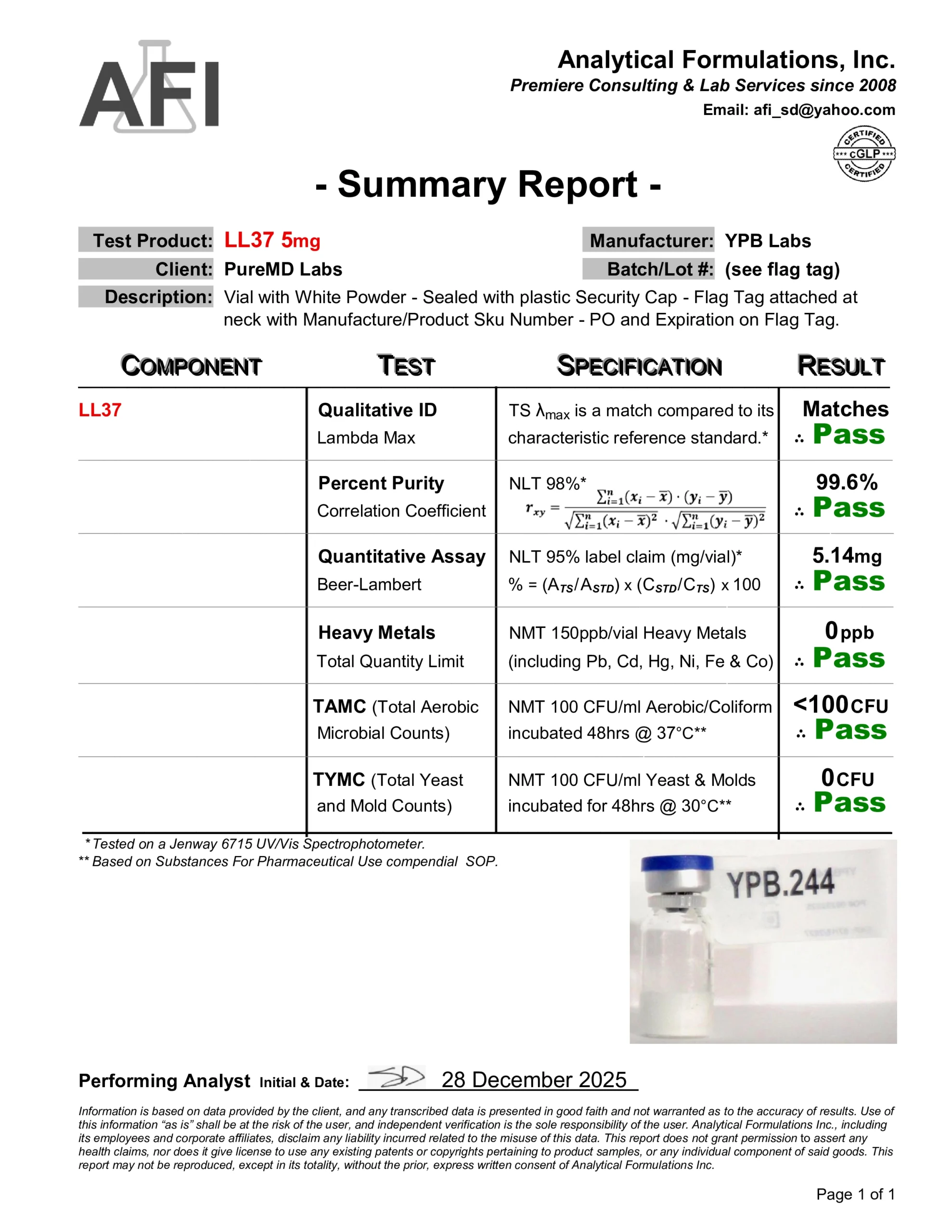 Each lot is sourced through our verified global supply chain with emphasis on traceability and quality control. We work diligently to obtain and maintain third-party analytical reports (HPLC/LC-MS) and Certificates of Analysis for each batch, as part of our ongoing quality process. These documents are reviewed internally and displayed as they become available. Independent third-party testing is also performed on select lots to confirm identity, purity, and alignment with our internal specifications.