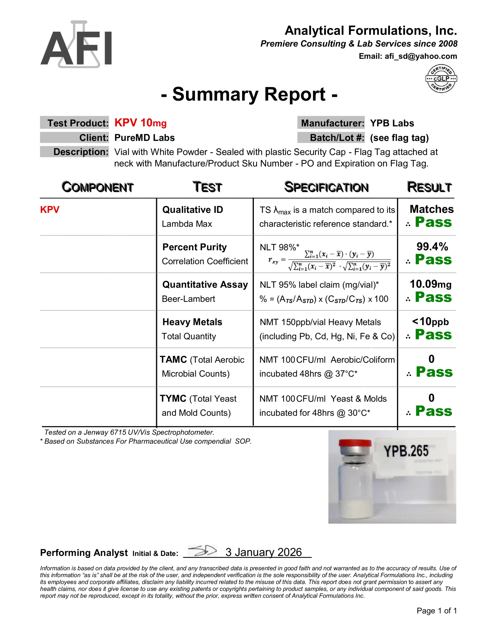 We require a verified purity of 99% or higher and perform independent third-party spot testing to confirm that select lots meet our internal standards for identity, purity, and composition. Where available, endotoxin testing results are included on Certificates of Analysis to verify laboratory purity; their inclusion is for research quality assessment only and does not imply suitability for human or veterinary use.