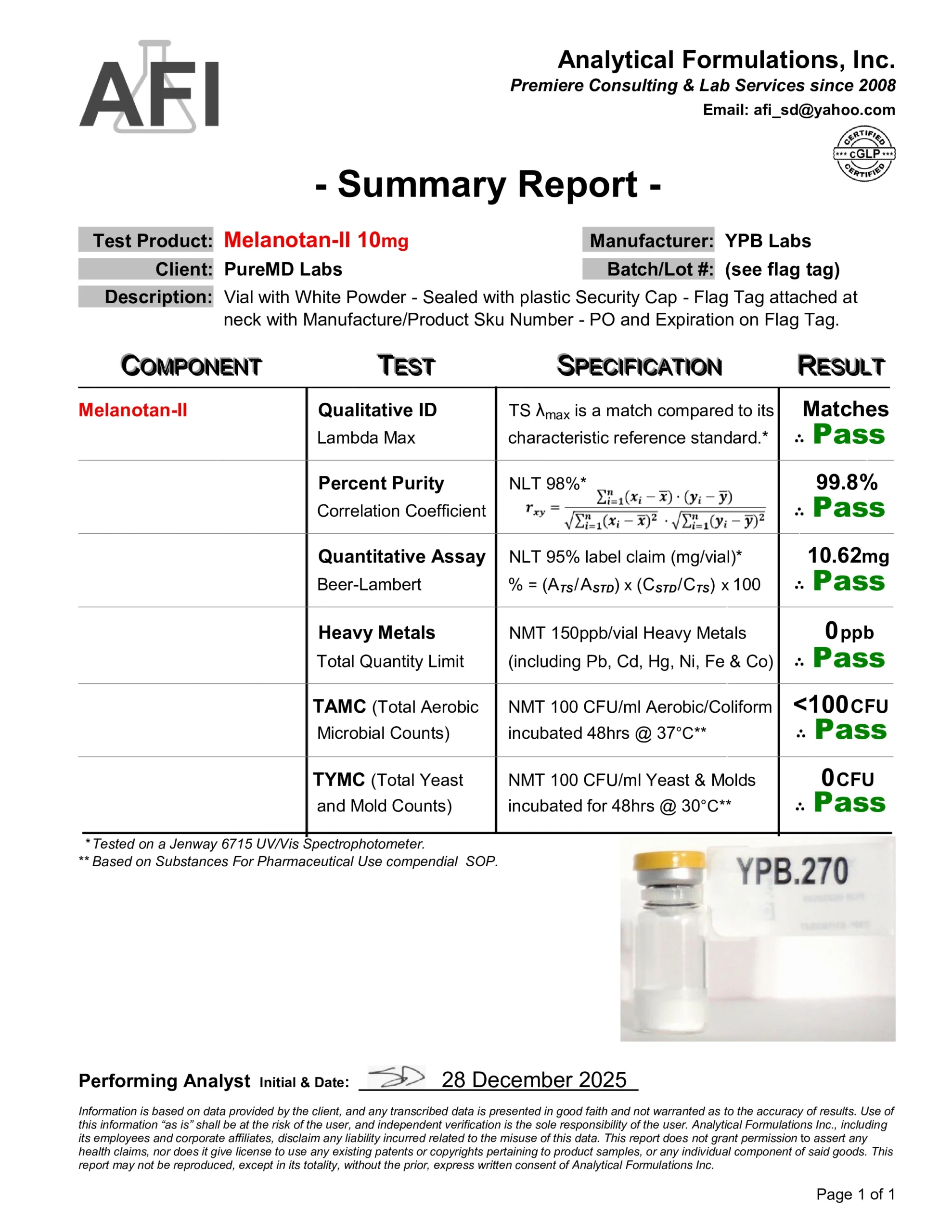 Each lot is sourced through our verified global supply chain with emphasis on traceability and quality control. We work diligently to obtain and maintain third-party analytical reports (HPLC/LC-MS) and Certificates of Analysis for each batch, as part of our ongoing quality process. These documents are reviewed internally and displayed as they become available. Independent third-party testing is also performed on select lots to confirm identity, purity, and alignment with our internal specifications.