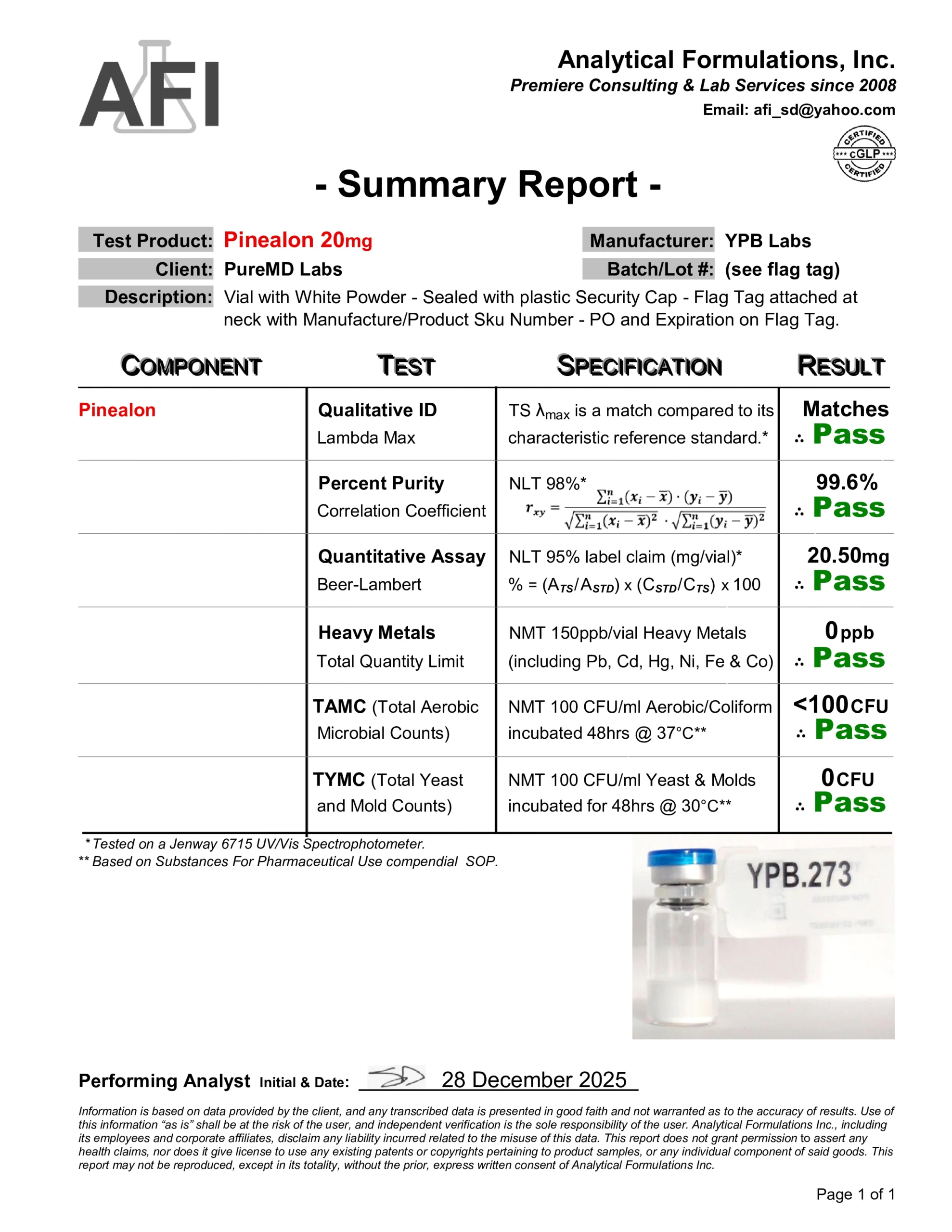 We require a verified purity of 99% or higher and perform independent third-party spot testing to confirm that select lots meet our internal standards for identity, purity, and composition. Where available, endotoxin testing results are included on Certificates of Analysis to verify laboratory purity; their inclusion is for research quality assessment only and does not imply suitability for human or veterinary use.