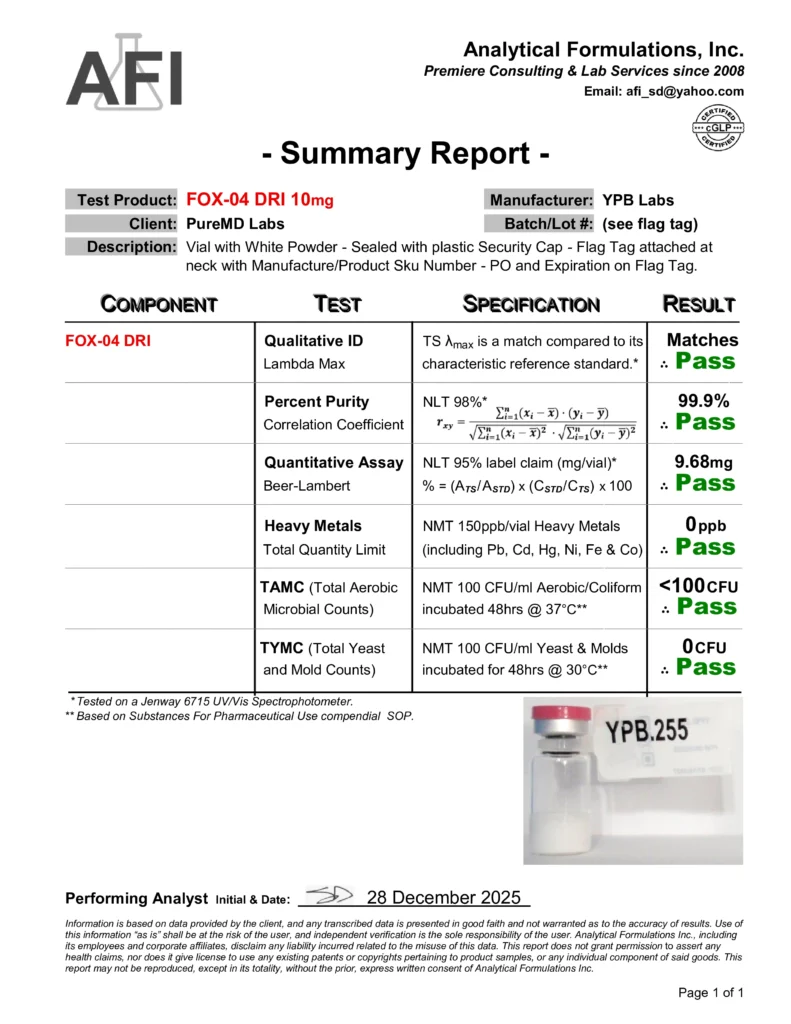 Each lot is sourced through our verified global supply chain with emphasis on traceability and quality control. We work diligently to obtain and maintain third-party analytical reports (HPLC/LC-MS) and Certificates of Analysis for each batch, as part of our ongoing quality process. These documents are reviewed internally and displayed as they become available. Independent third-party testing is also performed on select lots to confirm identity, purity, and alignment with our internal specifications.