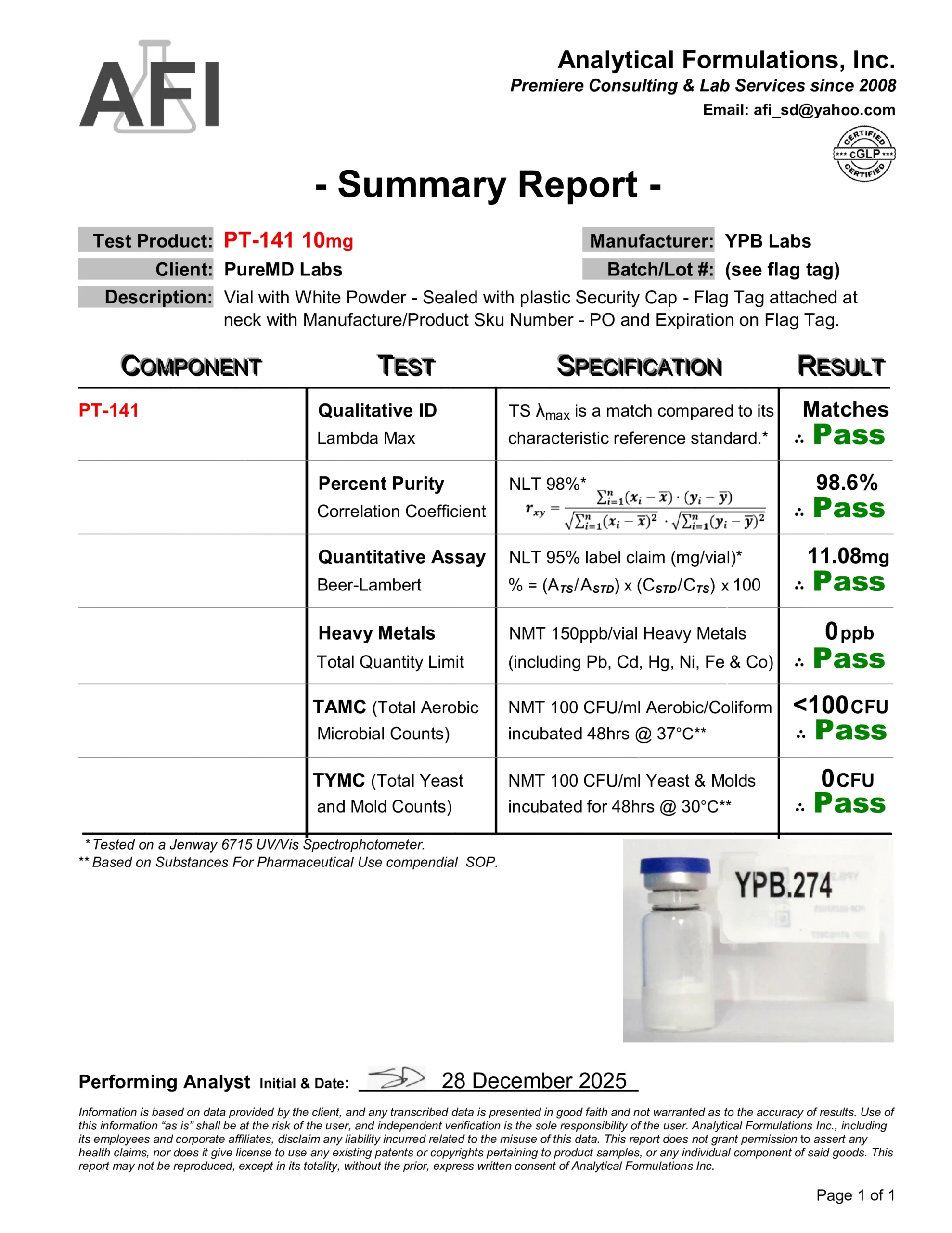 We require a verified purity of 99% or higher and perform independent third-party spot testing to confirm that select lots meet our internal standards for identity, purity, and composition. Where available, endotoxin testing results are included on Certificates of Analysis to verify laboratory purity; their inclusion is for research quality assessment only and does not imply suitability for human or veterinary use.