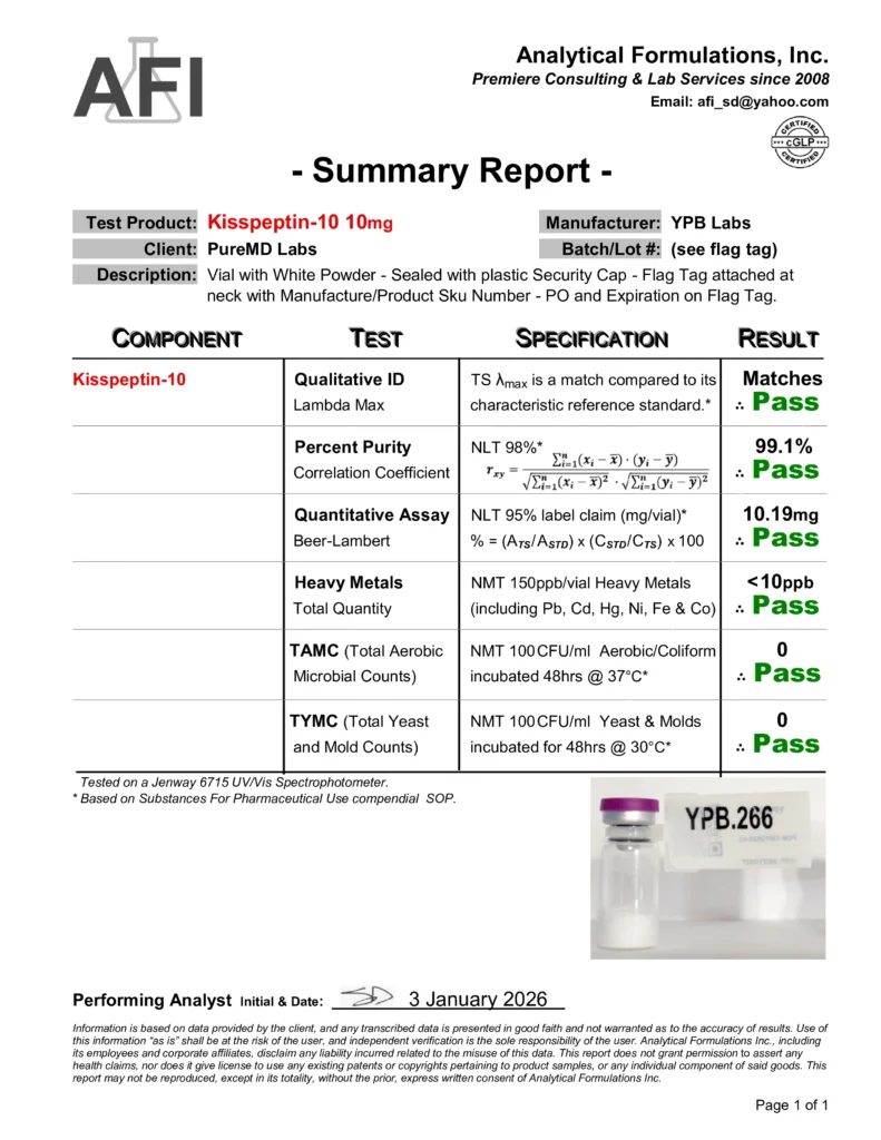 We require a verified purity of 99% or higher and perform independent third-party spot testing to confirm that select lots meet our internal standards for identity, purity, and composition. Where available, endotoxin testing results are included on Certificates of Analysis to verify laboratory purity; their inclusion is for research quality assessment only and does not imply suitability for human or veterinary use.
