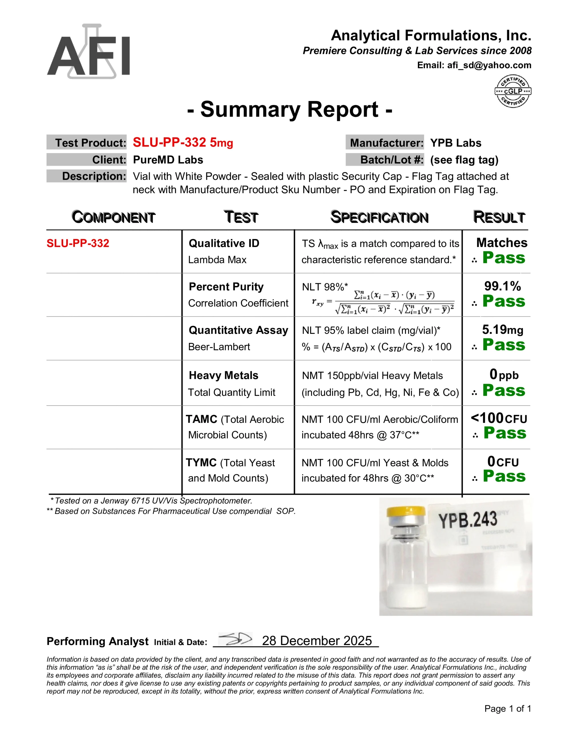 We require a verified purity of 99% or higher and perform independent third-party spot testing to confirm that select lots meet our internal standards for identity, purity, and composition. Where available, endotoxin testing results are included on Certificates of Analysis to verify laboratory purity; their inclusion is for research quality assessment only and does not imply suitability for human or veterinary use.