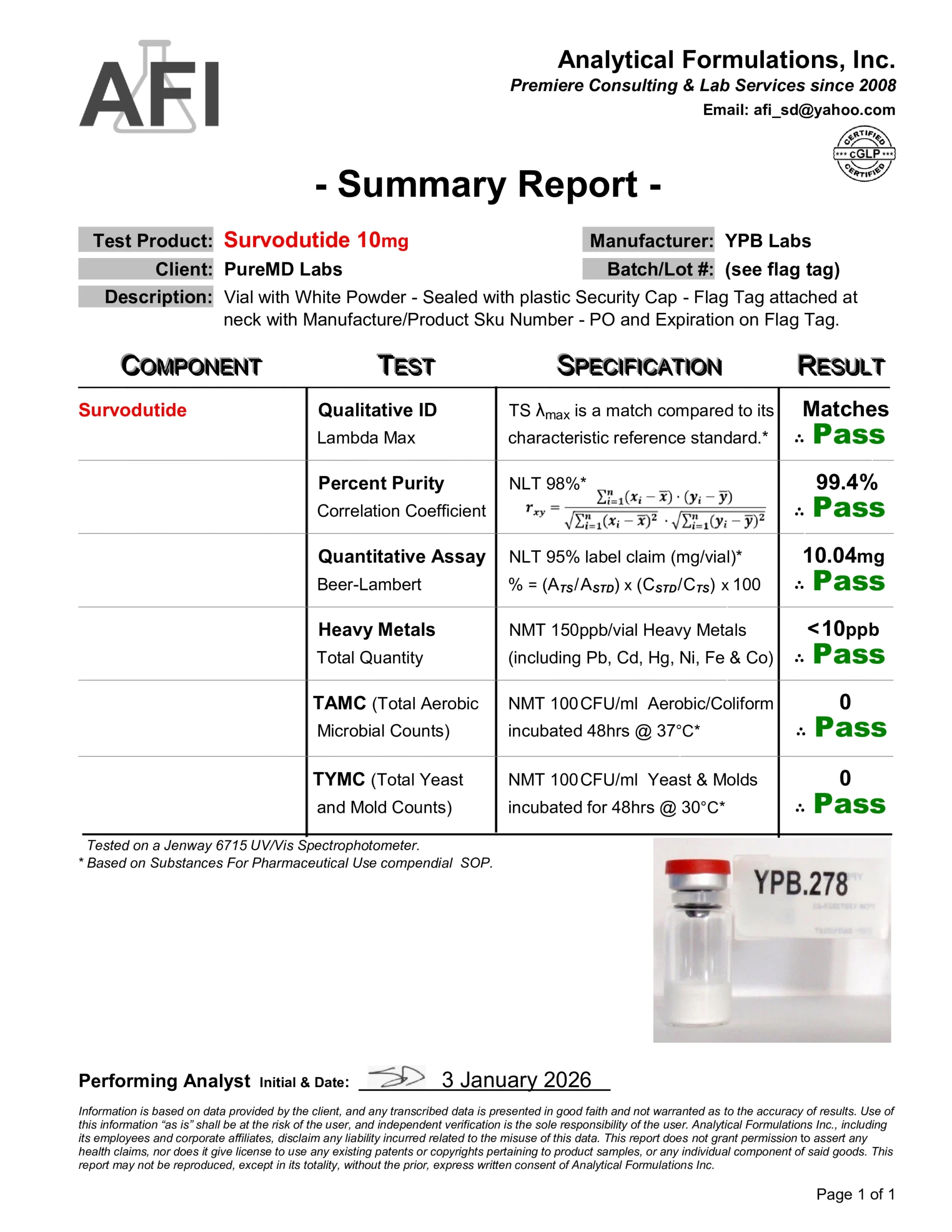 Each lot is sourced through our verified global supply chain with emphasis on traceability and quality control. We work diligently to obtain and maintain third-party analytical reports (HPLC/LC-MS) and Certificates of Analysis for each batch, as part of our ongoing quality process. These documents are reviewed internally and displayed as they become available. Independent third-party testing is also performed on select lots to confirm identity, purity, and alignment with our internal specifications.