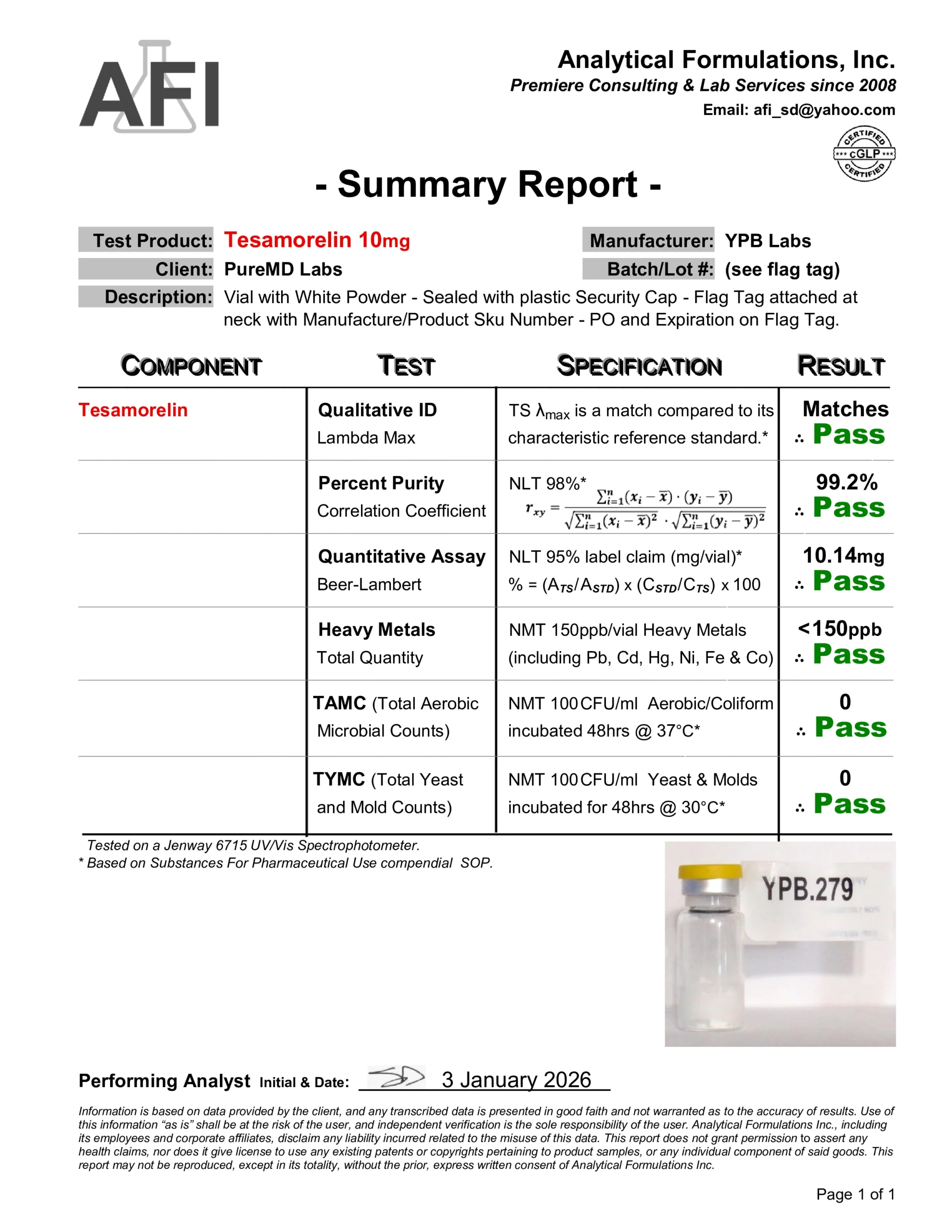 We require a verified purity of 99% or higher and perform independent third-party spot testing to confirm that select lots meet our internal standards for identity, purity, and composition. Where available, endotoxin testing results are included on Certificates of Analysis to verify laboratory purity; their inclusion is for research quality assessment only and does not imply suitability for human or veterinary use.