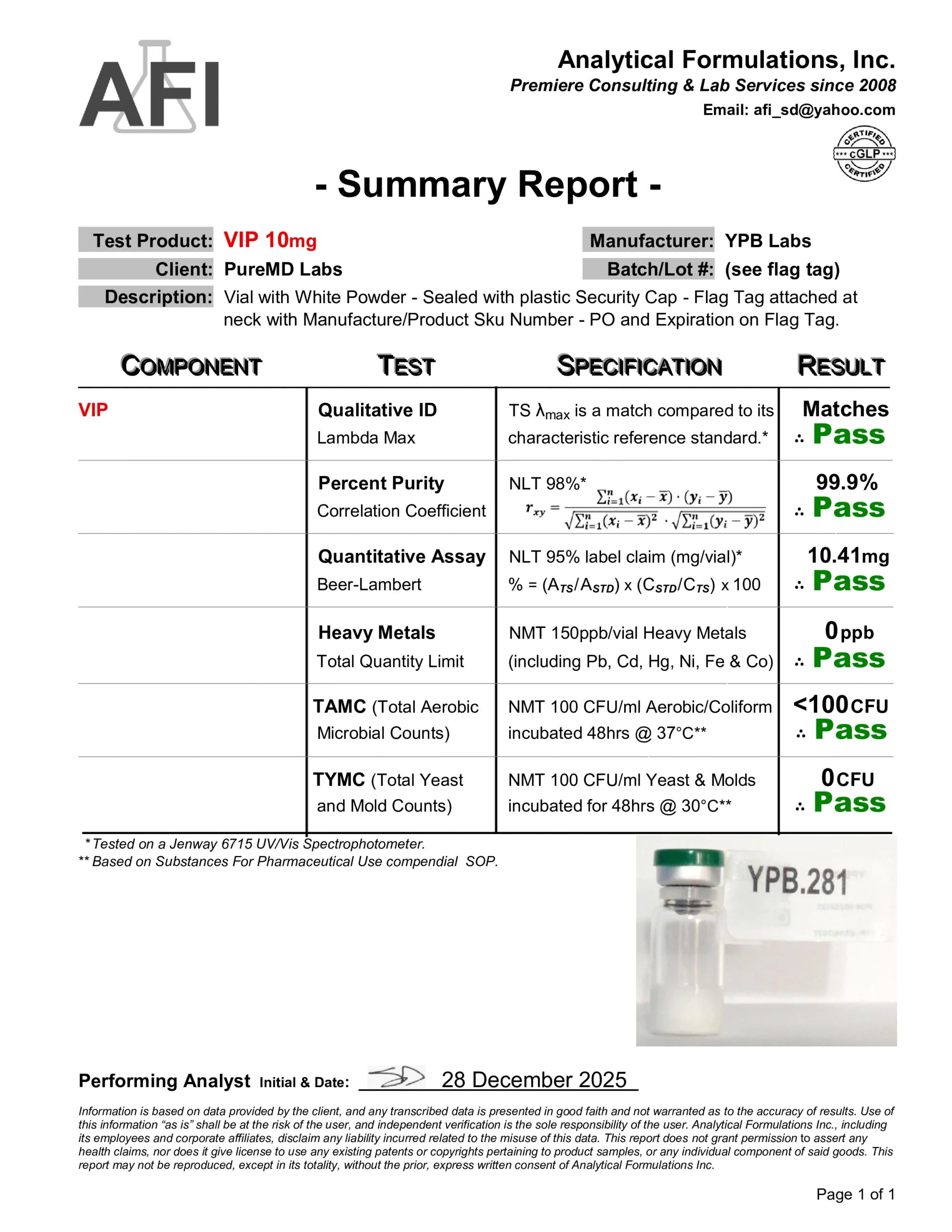 Each lot is sourced through our verified global supply chain with emphasis on traceability and quality control. We work diligently to obtain and maintain third-party analytical reports (HPLC/LC-MS) and Certificates of Analysis for each batch, as part of our ongoing quality process. These documents are reviewed internally and displayed as they become available. Independent third-party testing is also performed on select lots to confirm identity, purity, and alignment with our internal specifications.